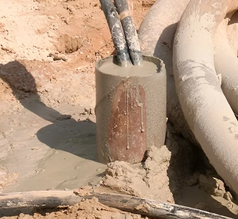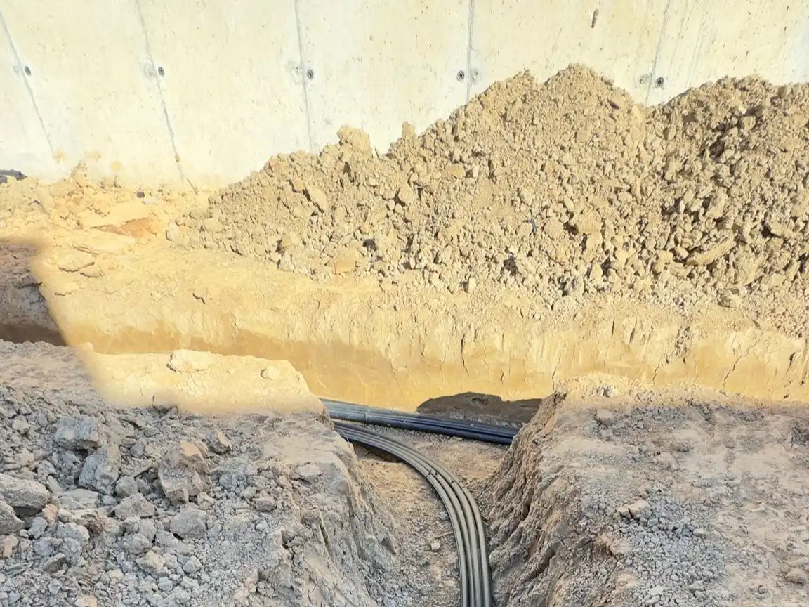 Excavación de terreno para el tendido de tuberías de geotermia, asegurando un contacto óptimo con el subsuelo.