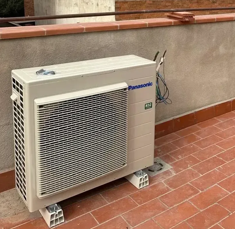 Unidad exterior de aerotermia Panasonic instalada en terraza, ideal para climatización eficiente y producción de ACS en viviendas.