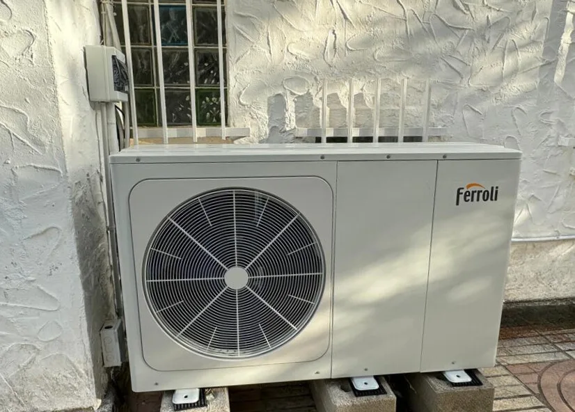 Unidad exterior de aerotermia Ferroli instalada junto a una fachada blanca, con soporte elevado para mayor seguridad y estabilidad.
