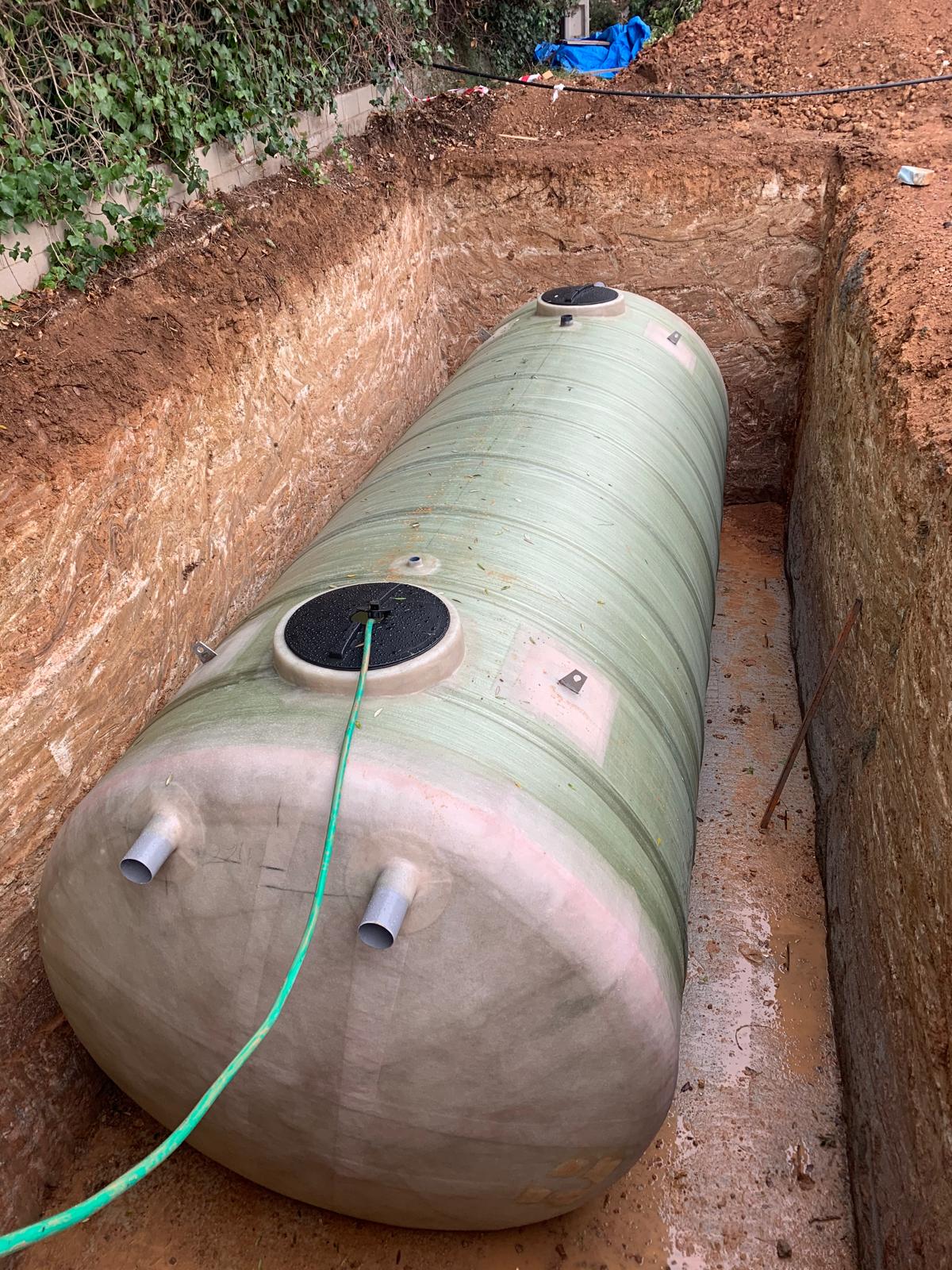 Depósito cilíndrico enterrado en proceso de instalación para la gestión y almacenamiento de aguas negras en vivienda unifamiliar.