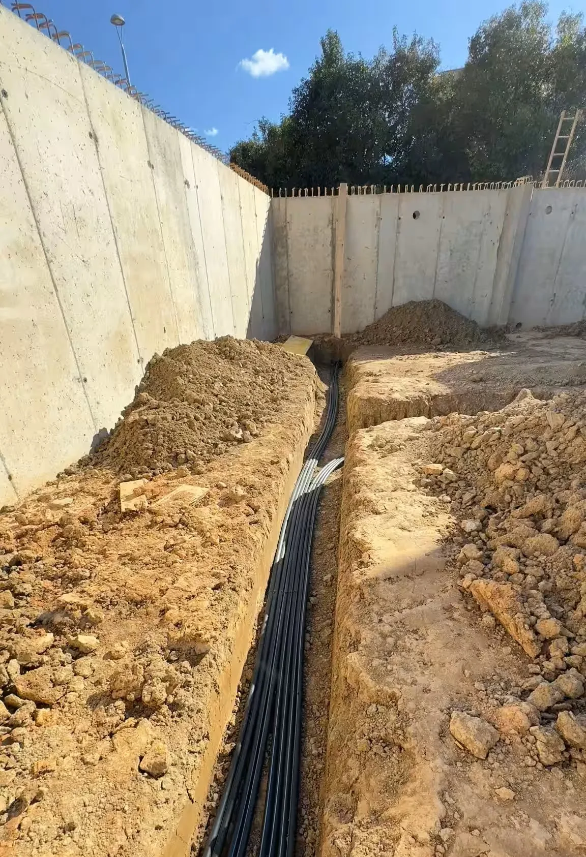 Conducciones geotérmicas instaladas en zanja profunda, listas para su conexión a la bomba de calor y el sistema hidráulico.