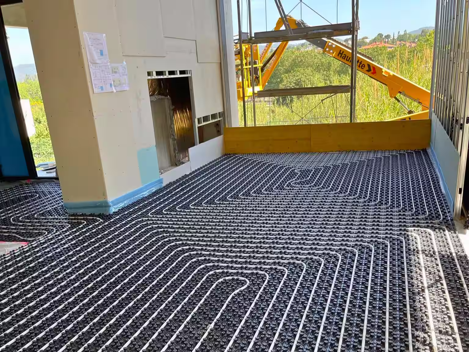 Instalación de tuberías de suelo radiante en habitación con vistas exteriores, sobre panel aislante con tetones negros y perfil perimetral azul.