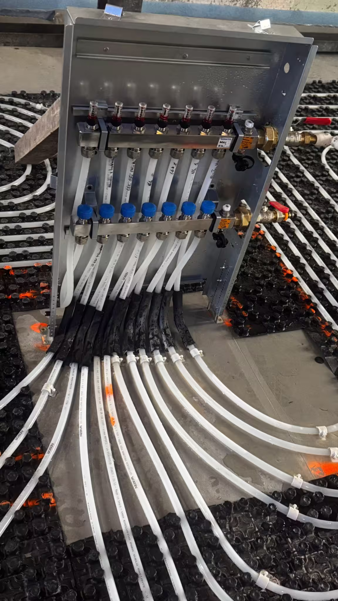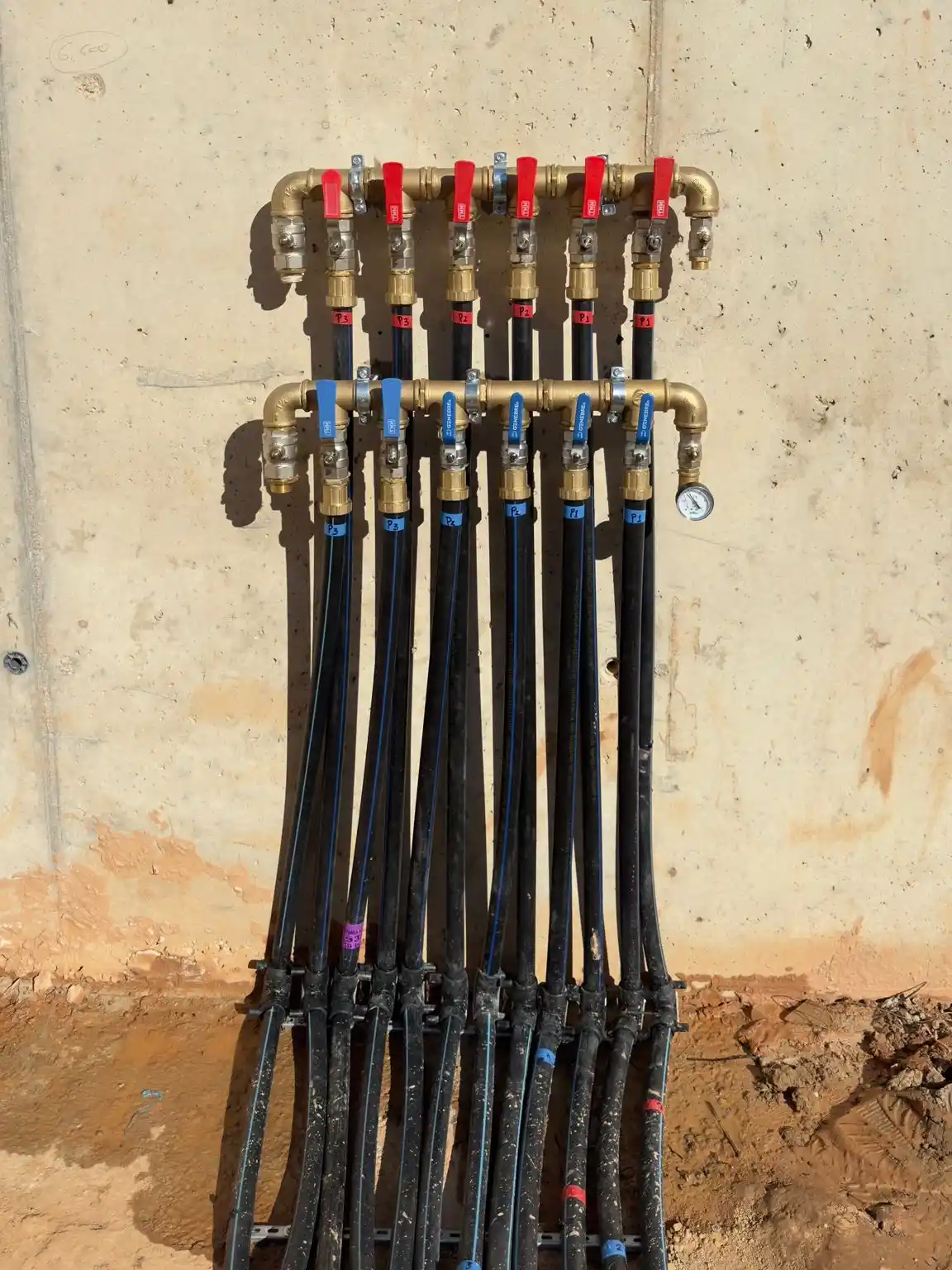 Tuberías geotérmicas identificadas con marcadores de colores para facilitar el montaje y el equilibrado del sistema.