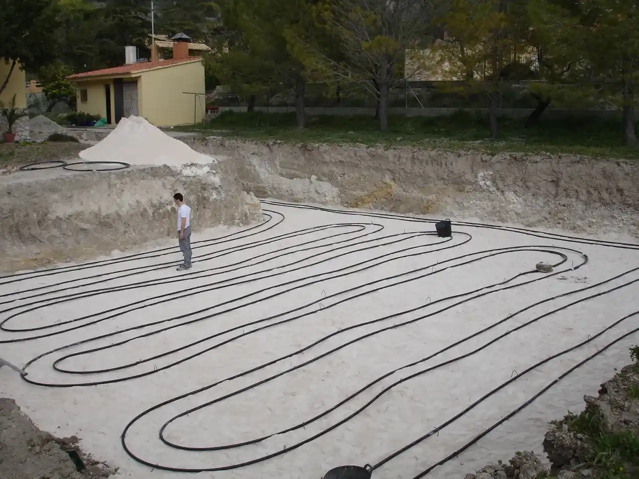 Instalación de tuberías para sistema geotérmico distribuidas en zanja, optimizando el intercambio de calor con el subsuelo.