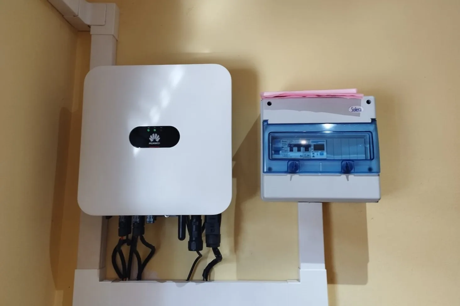Inversor solar Huawei instalado junto al cuadro de distribución, permitiendo el control y monitorización del sistema fotovoltaico.