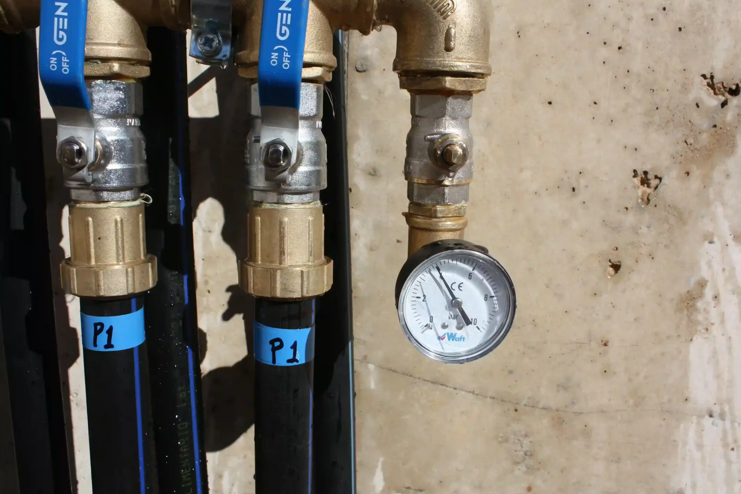Colector hidráulico de geotermia con llaves de paso y manómetro para monitoreo y mantenimiento del sistema.