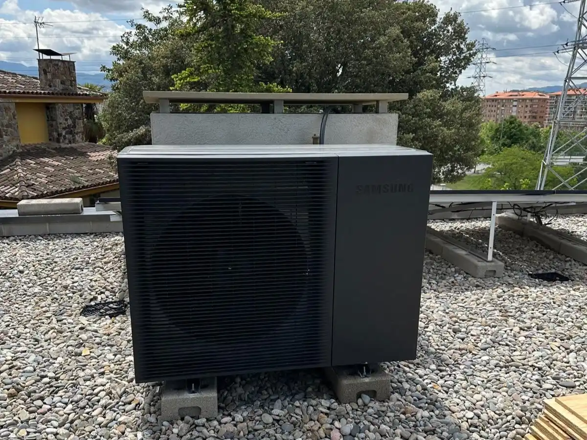 Sistema de aerotermia Samsung en color negro, ubicado en cubierta con grava, resistente y eficiente en condiciones exteriores.