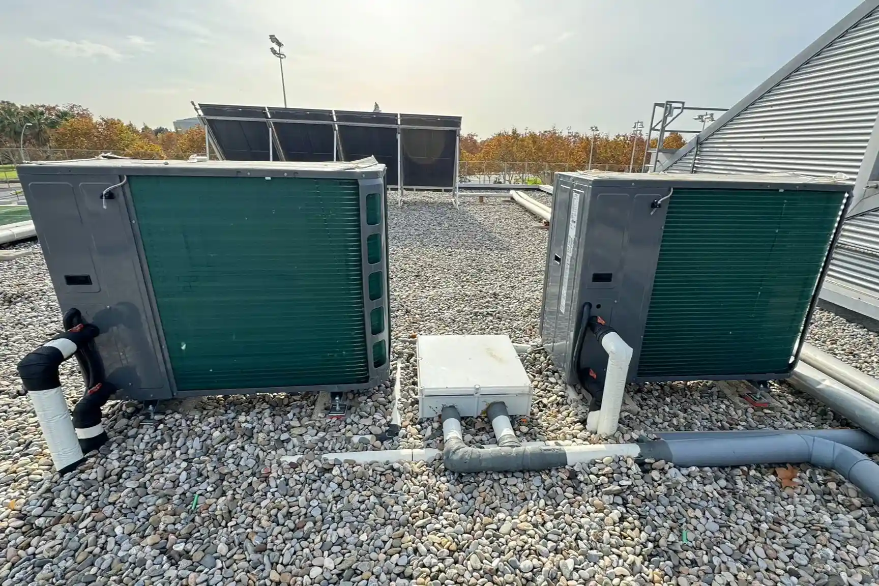 Instalación de equipos exteriores de aerotermia sobre cubierta, con conexiones hidráulicas visibles para la distribución del sistema.