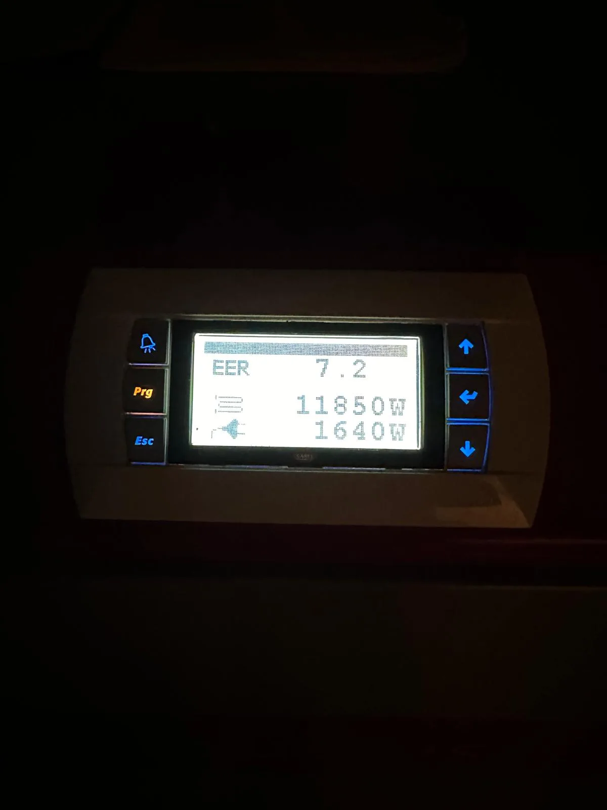Pantalla de control del sistema geotérmico mostrando valores de eficiencia, potencia y consumo en tiempo real.