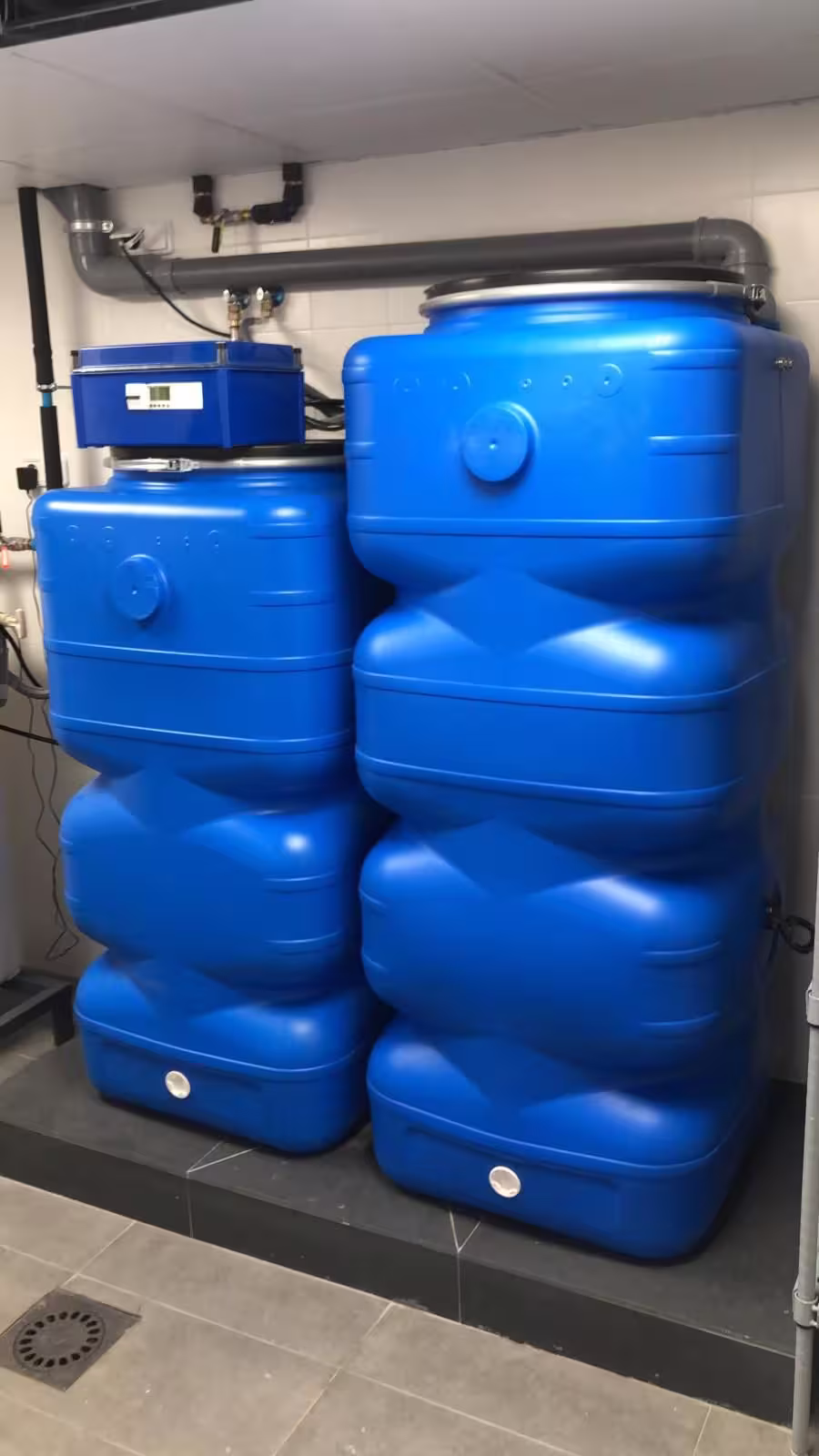 Sistema de reciclaje de aguas grises con doble tanque azul interconectado, equipado con controlador para gestionar la filtración y reutilización del agua en usos domésticos.